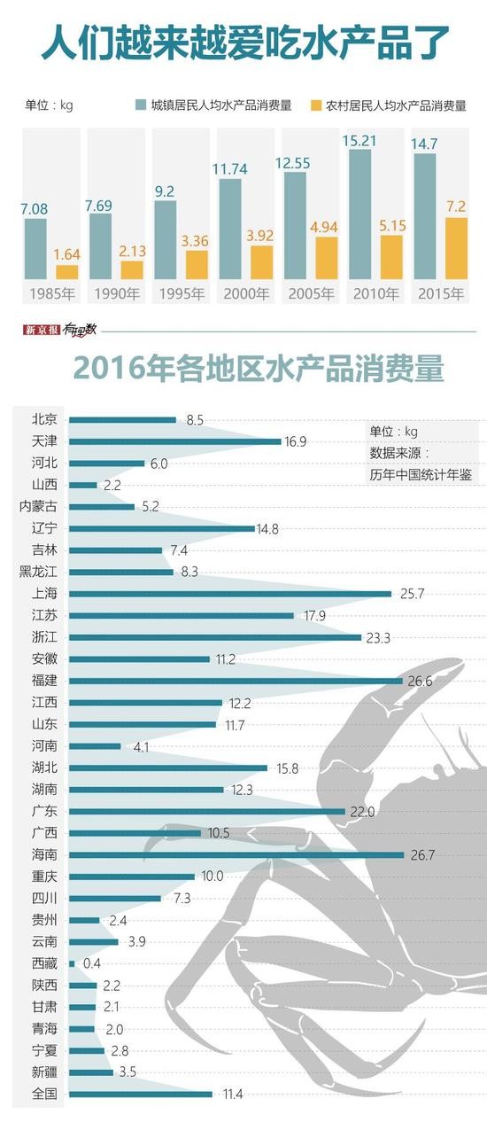 根据国家统计局《统计年鉴》,2015年,全国城镇居民人均水产品消费量为14.7公斤,农村居民人均水产品消费量为7.2公斤,分别是三十年前的2.1倍和4.4倍。