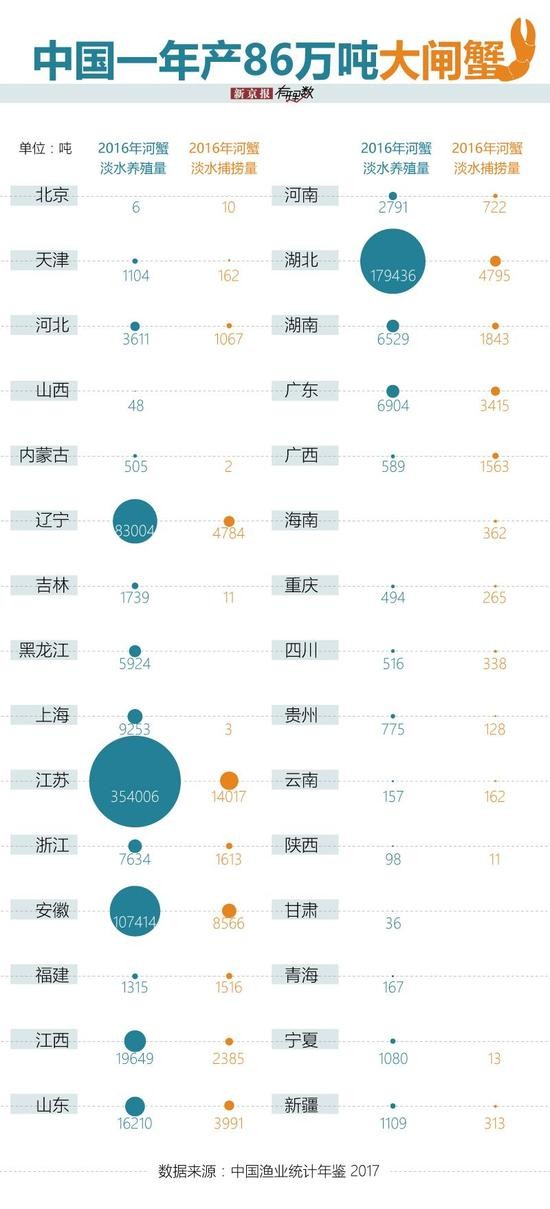 其实,国内的大闸蟹市场上,大部分螃蟹来自于江苏的兴化、高淳等以及湖北、安徽等地。据《中国渔业统计年鉴》,2016年,全国大闸蟹产量最高的江苏、湖北和安徽,三地的河蟹产量占到全国总产量的77%。