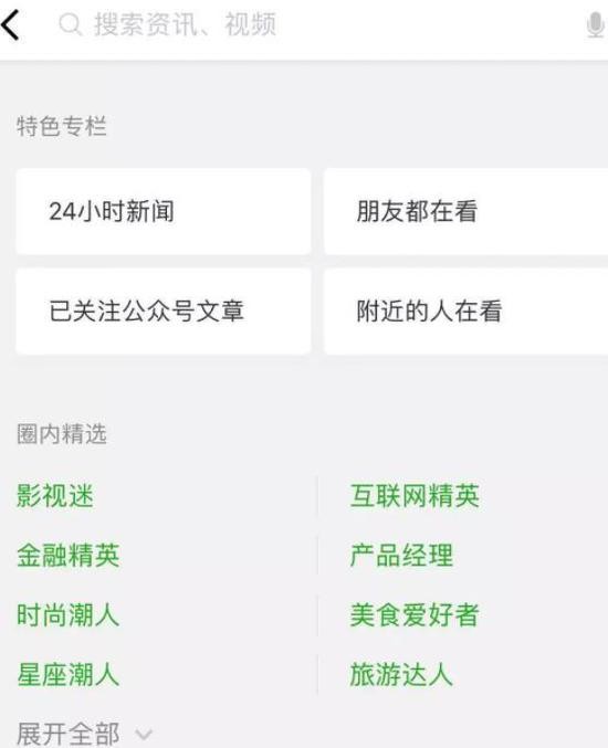 3、“看一看”页面增加了几个特色专栏,例如“朋友都在看”、“已关注公众号文章”等。