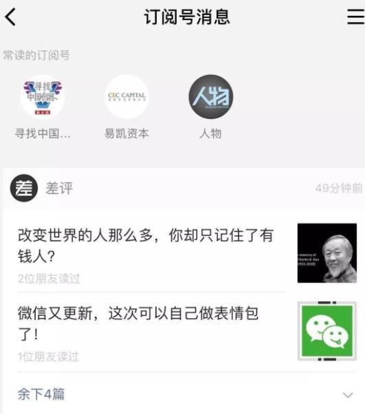 最大的两个变化:订阅号消息列表顶部新增“常读的订阅号”;“常读”和“星标”公众号在列表的头图显示为大图,其余则均为小图。