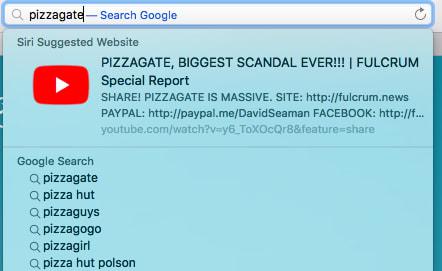 昨天当用户在Siri中输入“Pizzagate”,那么在浏览器的“Siri推荐网站”就提供了一个YouTube跳转连接,用户在点击之后会访问阴谋理论家David Seaman制作的“PIZZAGATE, BIGGEST SCANDAL EVER!!!”的视频。但是这段视频无法播放,而且Seaman的频道也因为违反YouTube的服务条款而下线。而多个Safari版本均出现这个搜索结果。