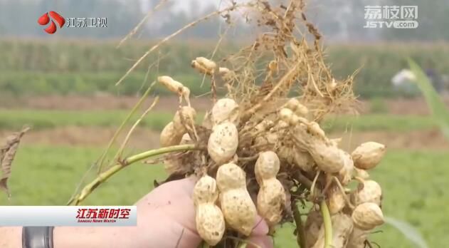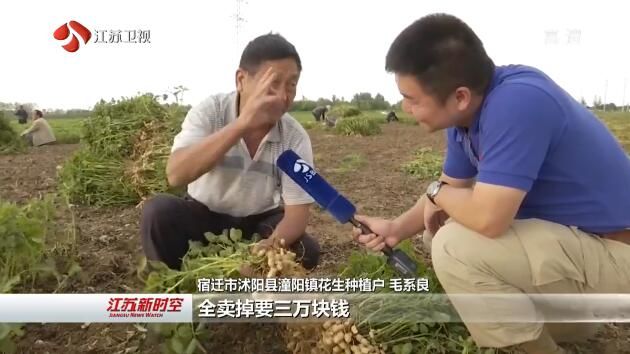 江苏台记者毛俊:“这里是宿迁沭阳县潼阳镇,五万亩花生喜获丰收,田里家家户户忙着收花生,充满了丰收的喜悦。您看,我随便拔起花生,抖一抖,花生个个饱满,比成年人的拇指还大。”