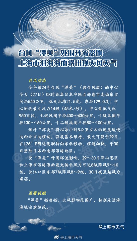 今年第24号台风“潭美”(强台风级)最大可能于29日前后在东经126度附近转向东北方向移动,受其外围环流影响,29-30日洋山港区和上海市沿海海面最大偏北风力可达8级阵风9-10级,长江口区东部7级阵风8-9级,30日夜里起风力减弱。