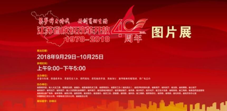 今年是中国改革开放 40 周年。江苏作为中国开放较早、经济发展较快的省份之一,一直走在改革开放的前列。为全面展示江苏改革开放的生动实践和巨大成就,由江苏省委宣传部等部门主办的 " 筑梦伟大时代,共创美好生活 " 江苏省庆祝改革开放 40 周年图片展将于 9 月 29 日至 10 月 25 日,在南京国际展览中心一层 E 号馆(南京市玄武区龙蟠路 88 号)举办。