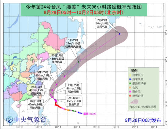 预计,“潭美”将以每小时15公里左右的速度向西北转北偏西方向移动,逐渐向琉球群岛南部海域靠近,今天夜间开始强度还将有所增强。29日白天将移入东海东南部偏东海域,以后逐渐转向东北方向移动,移速逐渐加快,并将于30日下午到晚上在日本国南部沿海登陆,预计登陆强度为强台风级(14-15级,45-50米/秒),随后将自西南向东北掠过日本国。受“潭美”影响,9月30日到10月1日上午日本国九州岛、四国岛和本州岛及其附近沿海将出现强烈的风雨天气。