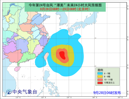 大风预报:28日08时到29日08时,东海大部、浙江沿海、福建沿海、台湾沿海、台湾海峡、巴士海峡、南海东北部将有6-7级大风,阵风8-9级,东海东南部和台湾以东洋面将有8-11级大风,台风中心经过的琉球群岛以南洋面的部分海域风力可达12-14级,阵风15-16级。