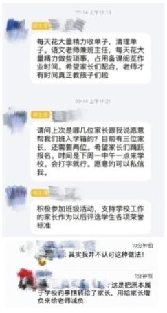 “班级群变成了另一个工作群,几乎每天都要在里面领任务。我工作忙,确实有点难以招架。有些工作,明明是老师和学生的分内事,为什么要家长来做?这是给家长增负来给老师减负。而且像做清洁、组织活动,其实也是教育的一部分,完全可以由老师引导学生自己尝试,无需家长代劳。”