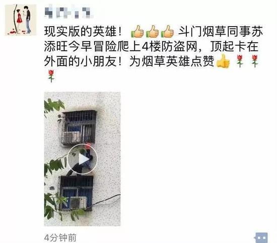 27日中午,珠海斗门一名年仅2岁10个月孩子,被父母反锁在家发生意外,小孩爬到窗台上颈部卡在防盗网中间命悬一线。附近单位一名职工听到路上呼救,徒手爬上四楼救人,托举孩子20多分钟,最终警民联手成功救下孩子。