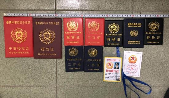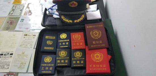 在刘某随身携带的公文包中,民警查获各式假军需证件12本,涉及工作证、军官证、持枪证等,伪造文书212份,另有100元面值假美钞128张。而且,刘某的假军官身份证件若不仔细辨别,确实真假难辨。
