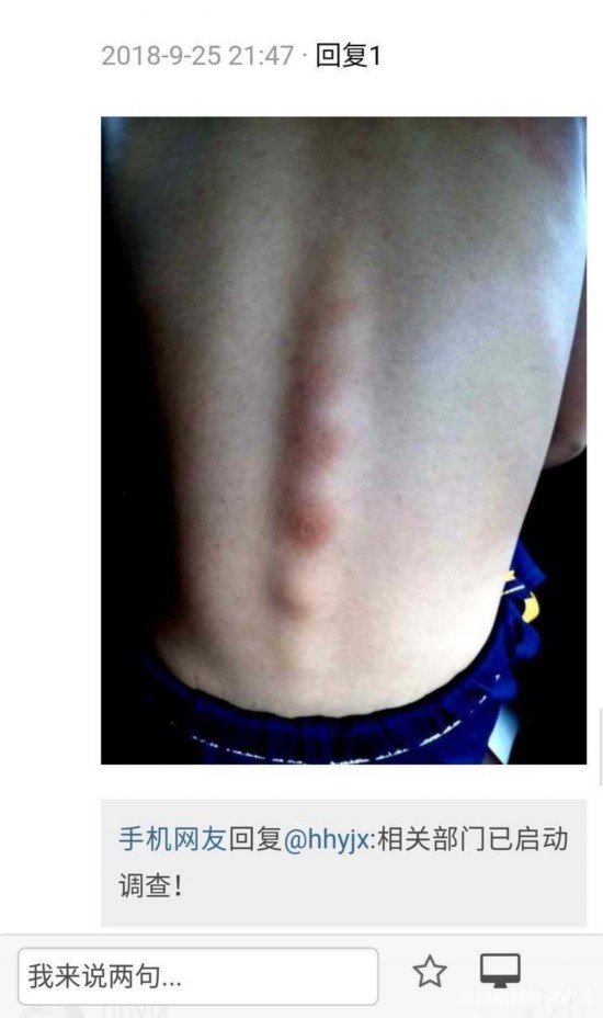 27日上午,遂宁市河东新区管委会官方微博发布了遂宁市河东新区社会事业局关于《小学女生被老师虐打致伤 校长要家长高风亮节》的回复:网友hhyjx在麻辣社区发布《小学女生被老师虐打致伤 校长要家长高风亮节》的帖子后,遂宁市河东新区社会事业局高度重视,于9月25日当晚21:00成立调查组,制定调查方案。公安机关同步介入调查。9月26日上午8:30,调查组进驻学校对相关人员进行调查、询问,现场收集证据。目前此事正在调查中。河东新区社事局将查清情况,客观公正处理好此次事件,同时在教育系统开展师德师风教育整顿活动,努力营造良好的教育环境。