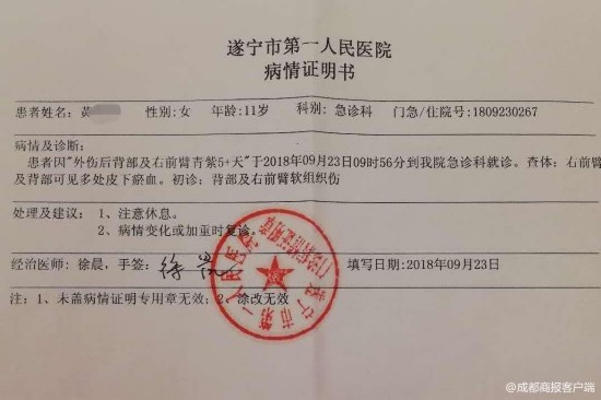 在刘女士提供的一张医院病情证明书上,病情及诊断显示右前臂及背部可见多处皮下淤血,初诊背部及右前臂软组织伤。