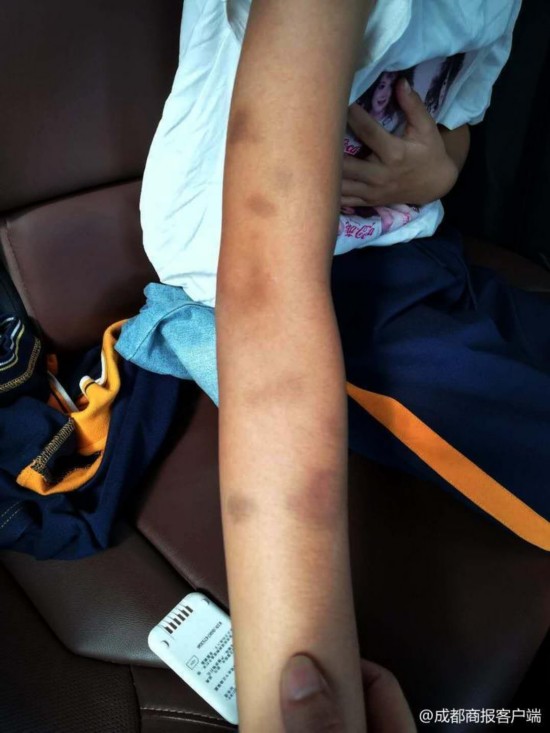刘女士介绍,遂州外国语小学校是一所寄宿制学校,每周星期五去接孩子回家。21日下午,她接到女儿后,发现女儿的右手手臂多处淤青,经过多次向女儿询问,她女儿才告诉她,星期二(18日)被数学老师喊到办公室做作业,因为一道题没有做对,老师就揪她手臂,还用手肘顶背部等。