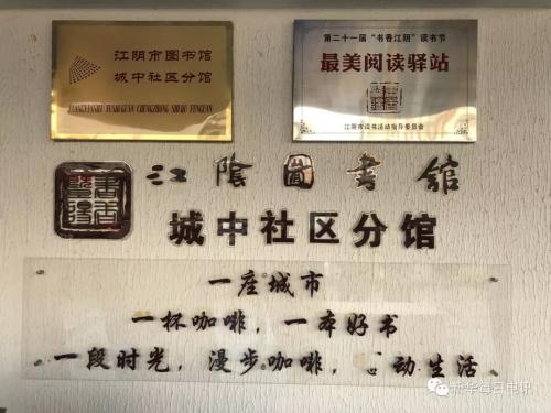 在江阴市最繁华的步行街东侧,与其他咖啡厅别无二致的“漫步咖啡”门口,“江阴图书馆城中社区分馆”和“最美阅读驿站”的金属牌匾十分抢眼,向人们印证了“一杯咖啡、一本好书、一段时光”的独特消费体验。