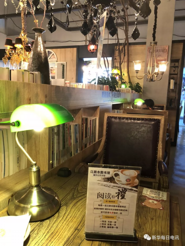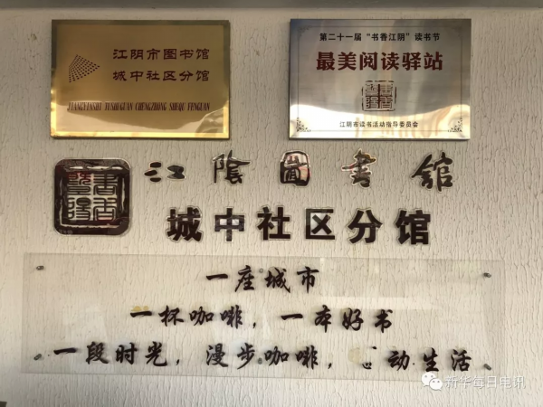 在江阴市最繁华的步行街东侧,与其他咖啡厅别无二致的“漫步咖啡”门口,“江阴图书馆城中社区分馆”和“最美阅读驿站”的金属牌匾十分抢眼,向人们印证了“一杯咖啡、一本好书、一段时光”的独特消费体验。