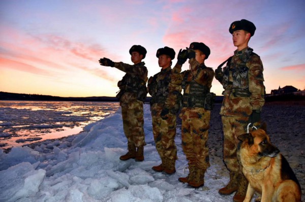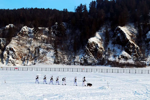 连队官兵在江边巡逻,途径漠河北极村标志性石碑“神州北极”。 摄影 李文学