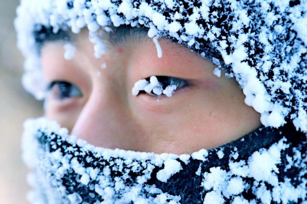 连队官兵展示结冰的睫毛,在漠河北极村,冬季最冷可达-52.3℃。“北极哨所”供图