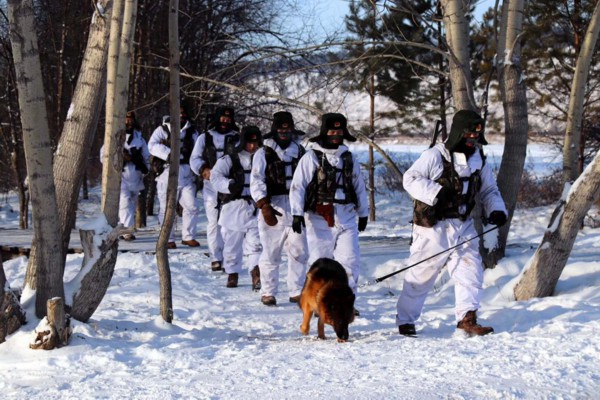 连队官兵在林中巡逻,身上衣物重达10斤。 “北极哨所”供图