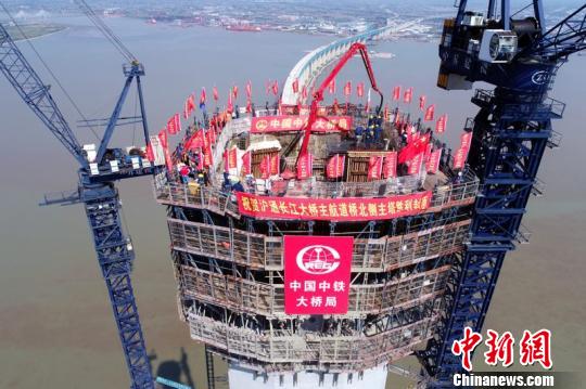 中新网南京9月28日电 (邢影 杨颜慈)9月28日,随着最后一方混凝土浇筑完毕,330米高的沪通长江大桥北侧主塔成功封顶,标志着由中铁大桥院设计、中铁大桥局承建的沪通长江大桥工程取得关键进展。