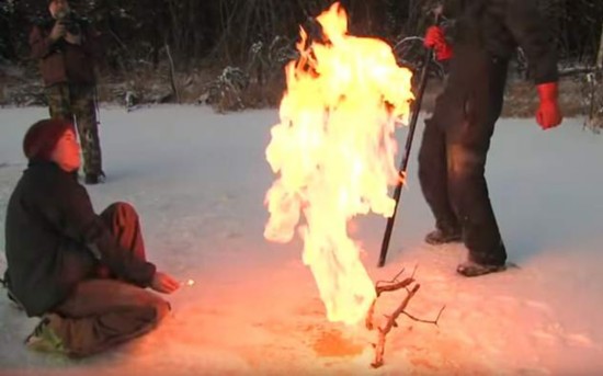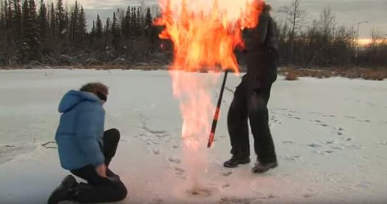 在一段拍摄于阿拉斯加湖的视频中,一位同事在冰冻的湖上打了一个洞,阿拉斯加费尔班克斯大学的教授凯蒂 沃尔特 安东尼点燃了从湖底逸出释放出的气体甲烷,爆发出明亮的橙色火焰。沃尔特 安东尼女士描述了这个过程,她说:“如果你打开冰封的地方,就会融化永冻土,其中的有机物就会被微生物分解。”