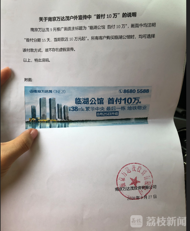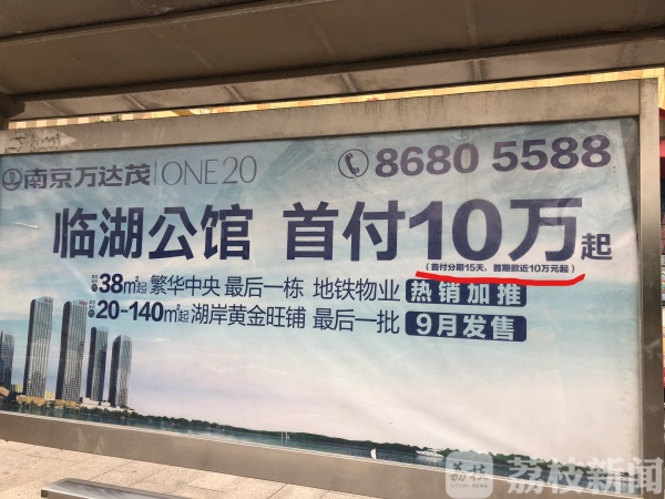 爆料人许女士称,前些日子她和先生一起开车经过位于仙林的万达茂商业体,被旁边两栋高楼上的巨幅广告吸引了:临湖公馆,首付10万起,最小38㎡,最后一栋。许女士立刻跟先生算了算帐,按照现在南京公寓的市场价,38㎡的公寓少说也要60万元左右,且政策规定公寓首付不低于房款的50%,但眼前这公寓首付居然低至10万元,太划算了!