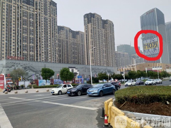 记者赶往仙林万达茂了解情况,原本挂在高楼上的巨幅广告已经不见了,但在万达茂项目周围仍多处可见受到质疑的那幅广告画面,记者1.2左右的视力,但距离五十米左右,基本就看不清广告上解释说明的小字了。