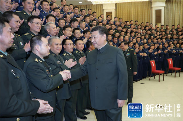 离开训练场,习近平来到79集团军机关,接见集团军机关全体干部和所属部队正团职以上干部,同大家亲切握手、合影留念。