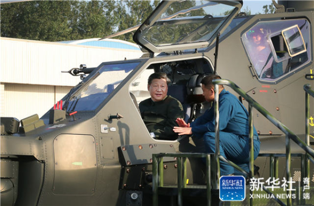 习近平察看了部队主战武器装备。武装直升机技战术性能怎么样?实际操作中好不好用?有没有需要改进的地方?习近平问得很仔细。直-10武装直升机是我国自主研制的第三代战机,习近平登上该型直升机,佩戴专用头盔,亲自操控机载武器及观瞄系统,了解有关装备情况。