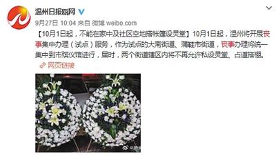 新京报消息 10月起,温州市将试点开展丧事集中办理服务,作为试点的大南街道、蒲鞋市街道,丧事办理将统一集中到温州市殡仪馆进行,届时,两个街道区域内将不再允许开设灵堂。网友质疑规定不尊重传统丧葬习俗,市殡仪馆有借机垄断经营之嫌。也有专家表示,当地民政部门此举无任何法律依据,集中到殡仪馆办丧事,则属于强制消费。详情》