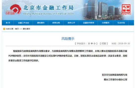 腾讯科技讯 9月30日消息,北京市金融工作局在其官网发布风险提示称,互联网金融风险专项整治清理整顿工作期间,未纳入整治范围的机构不得新开展P2P网贷业务;未经许可的机构不得新设立或从事P2P网贷业务活动。否则,按照从事非法金融活动处理。