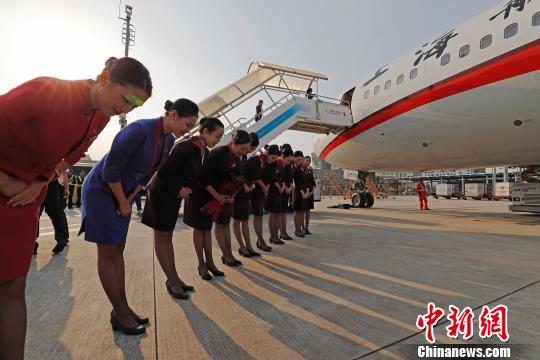 机组人员在飞机上举行了简短的仪式。殷立勤 摄