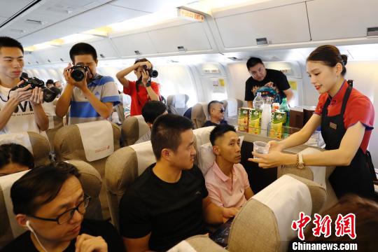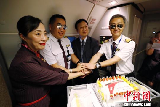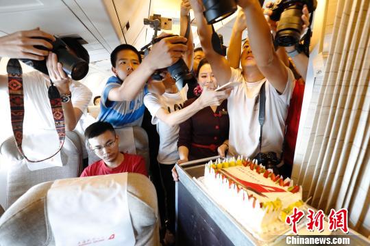 飞机上准备的蛋糕成为了飞友们聚焦的重点。殷立勤 摄