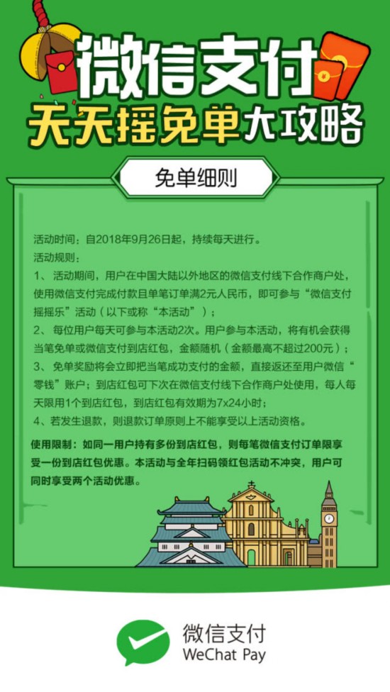即日起至12月底,用户在韩国、日本、新加坡、泰国、澳大利亚、新西兰等地的微信支付合作门店,使用微信支付消费成功,即可参与摇摇乐活动,有机会获得当笔免单或微信支付到店红包。