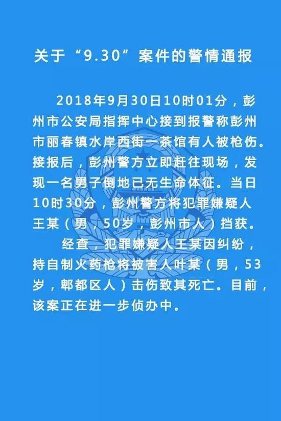 四川彭州警方通报:男子因纠纷持自制火枪伤人致其死亡: