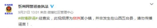 不过进一步搜索后记者发现,9月21日,山西忻州网警巡查执法官方微博对网传视频进行辟谣:“经查实,此视频源自非洲某小镇,并非发生在山西五台县,请勿传播谣言!”