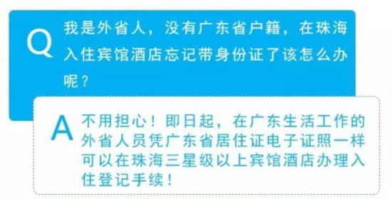 目前,珠海市已在三星级以上宾馆酒店试点应用居民身份电子凭证办理住宿登记,忘记带身份证的广东户籍居民,可以通过手机登录微信“粤省事”小程序出示本人居民身份电子凭证办理住宿登记。