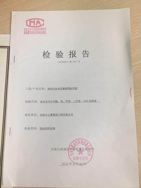 检验报告显示,在推迟开学期间(8月27日-8月29日),负责澳新学校升级改造项目的河南天之翼装饰工程有限公司,委托河南久陆诚信环境监测有限公司,对“室内空气样本中甲醛、苯、甲苯、二甲苯、tcov的浓度”,进行采样检测。
