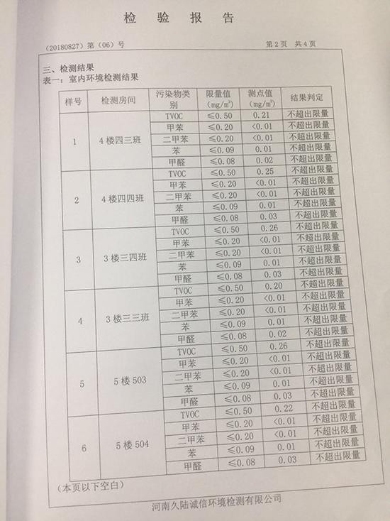 这份盖有河南久陆诚信环境监测有限公司红色印章、日期为8月29日的检验报告显示,8个样本(编辑注:每层抽检两个教室,每个教室1个样本)的5项污染物检测结果,全部“不超出限量”。其中,甲醛限量值为小于等于0.08毫克每立方米,8个样本中7个检测结果都小于等于0.03毫克每立方米,只有1个样本为0.04毫克每立方米。而甲苯、二甲苯、苯,限量值分别为0.20毫克每立方米、0.20毫克每立方米、0.09毫克每立方米,8个样本这3项污染物的检测结果全为0.01毫克每立方米。