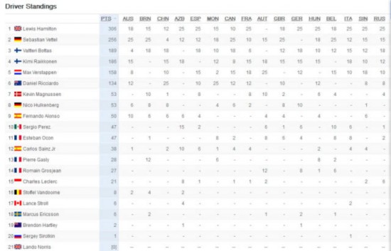 在目前的车手积分榜上,汉密尔顿的积分已经来到了306分,领先第二名的维特尔已经有50分的优势,而赛季只剩下5站比赛。本站比赛获得18个积分的博塔斯反超了莱科宁,以189分排名第三,莱科宁以186分排名第四,接下来依次是维斯塔潘的158分和里卡多的134分。(李田友)