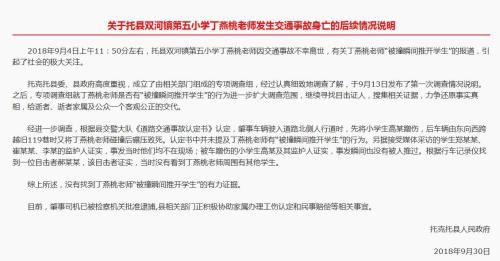 情况说明中提到,2018年9月4日上午11:50分左右,托县双河镇第五小学丁燕桃老师因交通事故不幸离世,有关丁燕桃老师“被撞瞬间推开学生”的报道,引起了社会的极大关注。