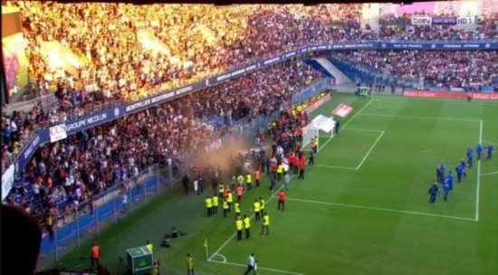 第81分钟比赛再次意外中断,蒙彼利埃球迷与警察发生冲突,现场出现了不明橘黄色烟雾,大量防暴警察进场聚集在看台边防止事态继续扩大,最后球员代表到场边与球迷交流后总算平息了骚乱,比赛在中断近30分钟后得以恢复,蒙彼利埃也最终如愿以3-0的比分赢下这场德比大战。