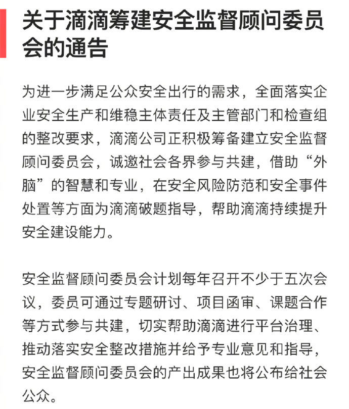 滴滴筹建安全监督顾问委员会 邀犯罪心理专家加入