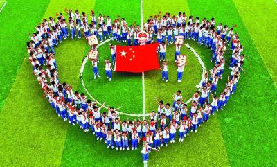 9月29日,江西省南昌市西湖区桃花中心幼儿园组织孩子们开展迎国庆主题教育活动。小朋友们挥舞着国旗,组成心形图案,寓意“祖国在我心中”,表达对祖国的热爱。李刚摄/光明图片