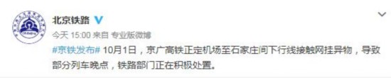 中新网10月1日电 10月1日15时,中国铁路北京局集团有限公司在微博发布消息称,京广高铁正定机场至石家庄间下行线接触网挂异物,导致部分列车晚点,铁路部门正在积极处置。