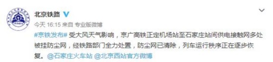 16时15分许,中国铁路北京局集团有限公司更新消息称,受大风天气影响,京广高铁正定机场站至石家庄站间供电接触网多处被挂防尘网,经铁路部门全力处置,防尘网已清除,列车运行秩序正在逐步恢复。