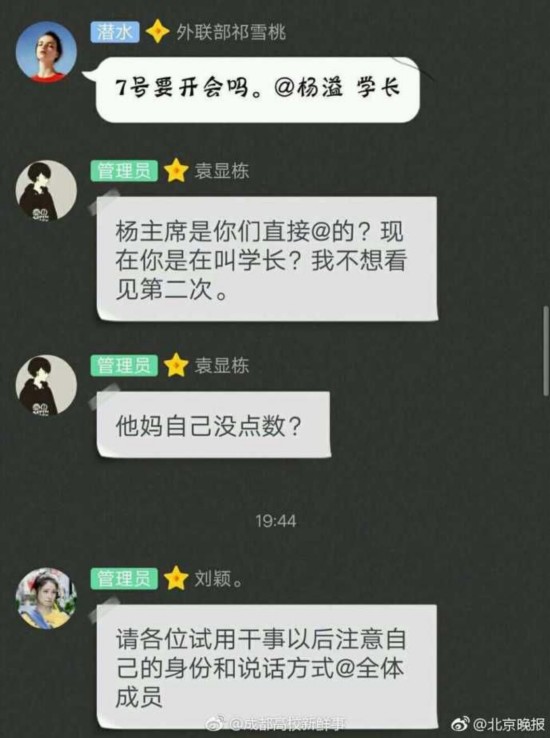 近日,有网友爆料:某学校学生会同学在群里问“7号要开会吗”,并@了学长,紧接着群管理员跳出来提醒她,请注意自己的干事身份和说话方式。