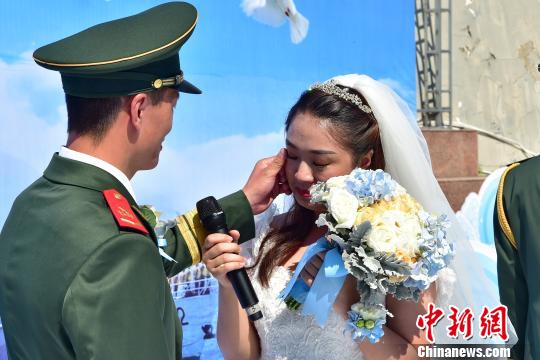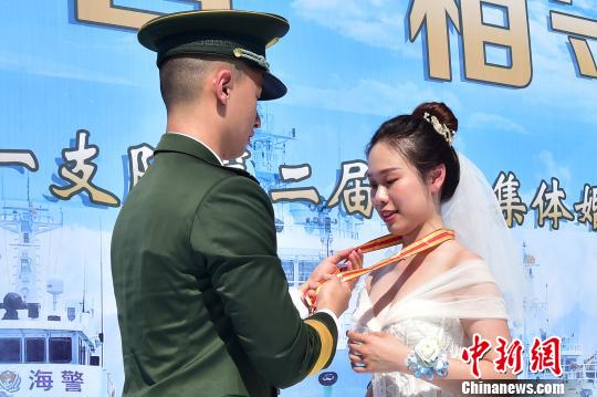 海警官兵为自己的新娘带上婚戒。沈灿煌 摄