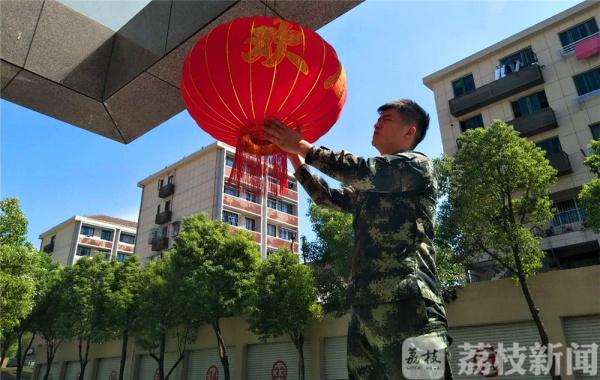 大红灯笼高高挂,喜迎国庆氛围浓。机关营区处处洋溢着节日的喜庆。