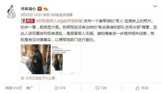 9月25日当天,就有网民在微博晒出一张照片,一名佩戴“联合国维和部队总司令部”臂章、身着春秋常服军装的“大校”,在火车上招摇,引来周围人的侧目。照片一发出,立即引来众多网民围观,纷纷指出这是假冒军人:我军从来没有“联合国维和部队总司令部”这一单位,一看就不知从哪“淘”来的假冒产品。