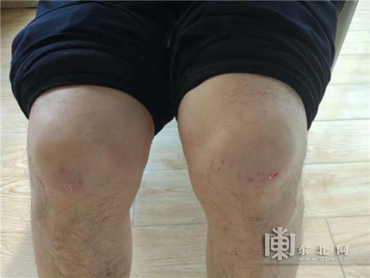 民警冯国辉为救人磕伤的膝盖。 王时 摄