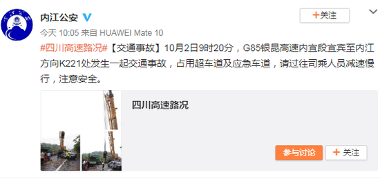 【交通事故】10月2日9时20分,G85银昆高速内宜段宜宾至内江方向K221处发生一起交通事故,占用超车道及应急车道,请过往司乘人员减速慢行,注意安全。